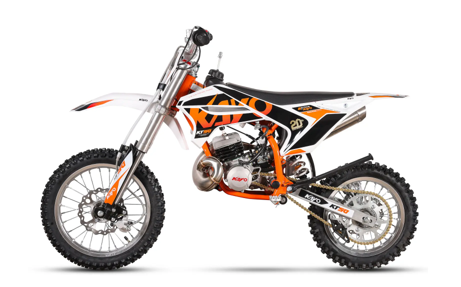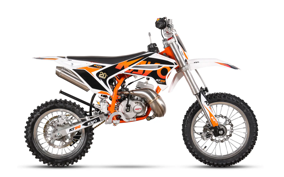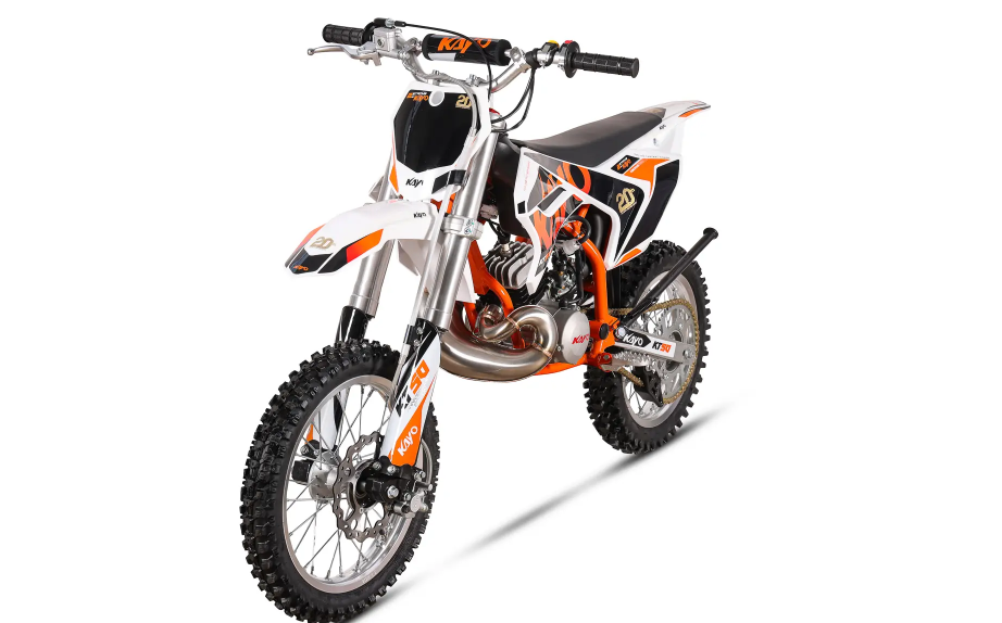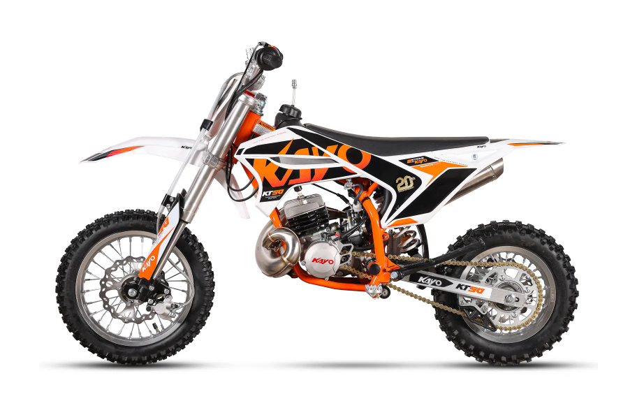 The Kayo KT50 mini is a 50cc, 2-stroke, beginner's motocross bike for kids, featuring an automatic transmission for ease of use, electric and kick start options, and a lightweight, durable frame. It is designed for young riders to learn motocross and is available with different wheel sizes to suit a rider's growth