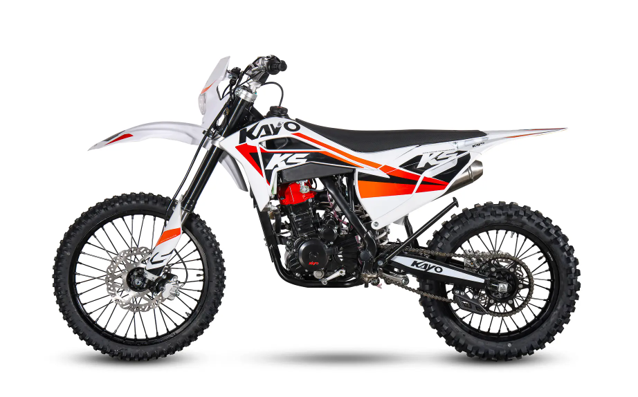 The Kayo K5 300 Enduro is a versatile dirt bike featuring a 279.6cc liquid-cooled 4-stroke engine, a 6-speed gearbox, and adjustable suspension, designed for performance on trails and green lanes. It is positioned as a higher-spec, more powerful option than smaller displacement bikes like the Honda CRF250F, but with a lower price point than full-on race bikes. Key features include a steel frame, a stainless exhaust, electric start, and a balance shaft in the engine for smoother operation.