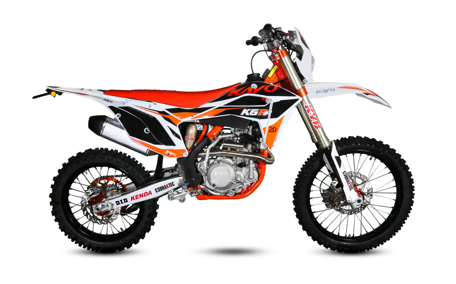 The Kayo K6-R is a full-size dirt bike designed for competition, featuring a 250cc, 4-stroke, liquid-cooled, DOHC engine with a 6-speed transmission. It comes equipped with high-performance components like fully adjustable KYB suspension and a lightweight chromoly frame, making it suitable for both trail riding and track use at a competitive price.