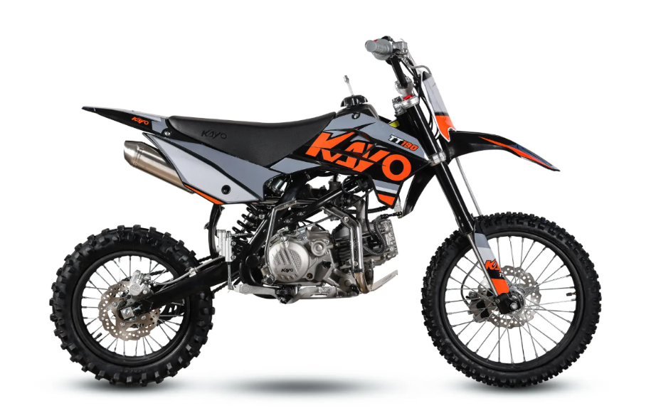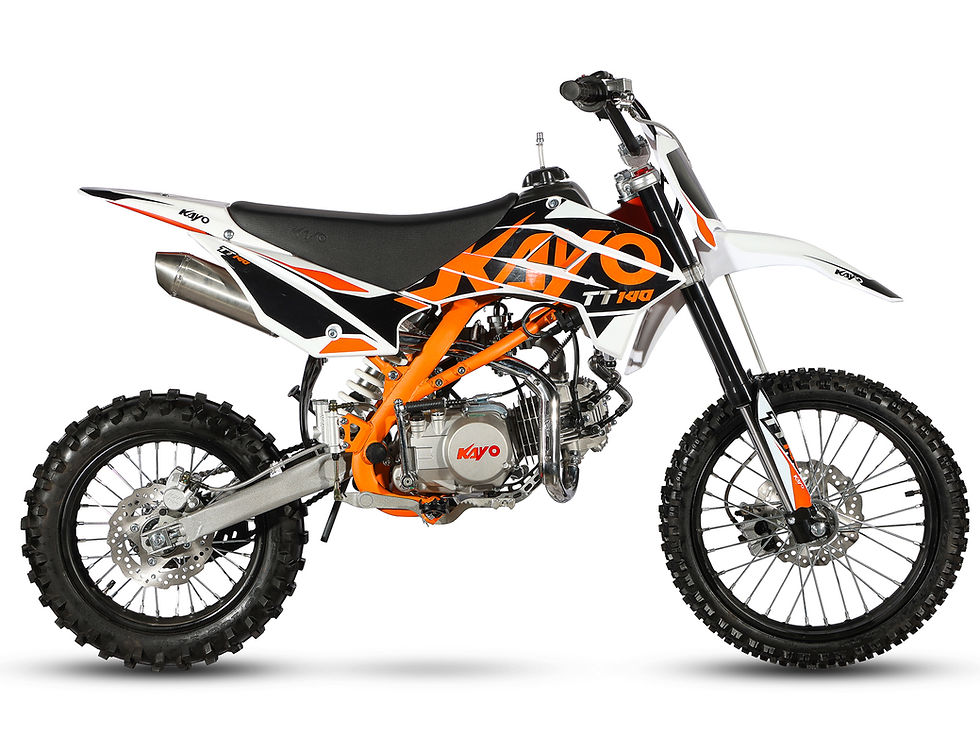 The Kayo TT140 is a 140cc pit bike designed for serious riders, featuring a YX140 engine, a durable twin-spar frame, and a stainless steel exhaust. It is equipped with modern components like USD forks and massive rear suspension travel for superior handling and is finished with aggressive graphics and plastics. The bike has a manual four-speed transmission, kick start, and is suitable for track use and field racing.